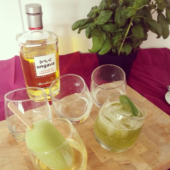 Gin mit Gurken-Zitronen-Eis am Stiel (ca. 4cl Gin in ein Glas füllen und ein Eis am Stiel andersherum mit hinein stellen. Das Eis schmeckt dann beschwipst; der Gin wird dadurch gekühlt. Ein Win-Win-Cocktail, also.)