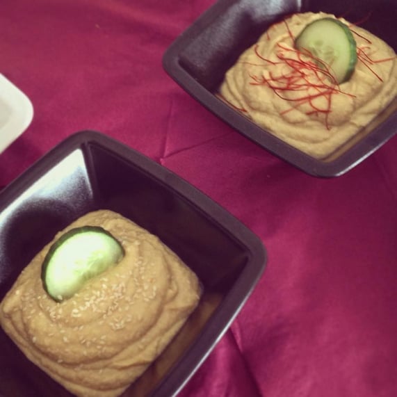 Obers trifft Sahne: Sushi-Variation mit Bulgur und Gemüse, Spargelsalat mit Ingwer und Kresse, Mezze: Falafel, Hummus, Halloumi mit lauwarmem Chili-Honig-Gemüsesalat und Minzjoghurt, Tomaten-Granita mit süßem Basilikumpesto und Gin Tonic-Gelée