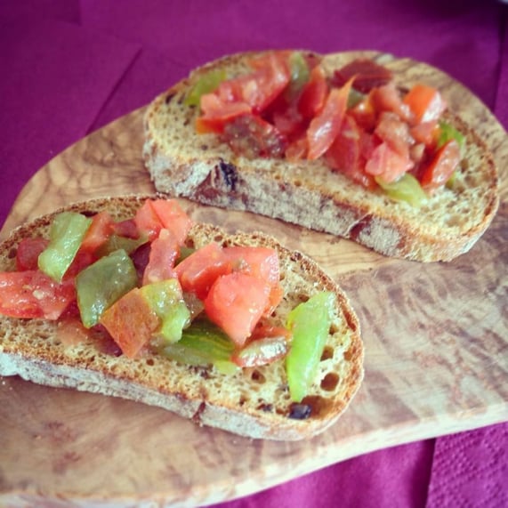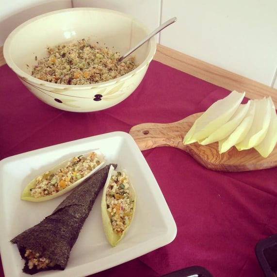 CorumBlog: Bulgur-Sushi, mit Bulgur und Halloumi gefüllte Tomaten, Falafel-Frikadellen mit Spargel-Zuckererbsen-Gemüse, karamellisierter Chicorée mit Gin-Erdbeeren und gerösteten Kichererbsen