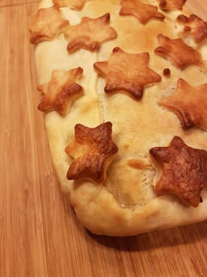 Zur Verzierung kann man jetzt mit einer Gabel den Rand um den Braten leicht eindrücken (wie bei Ravioli-Nudeln) und aus dem restlichen Teig Formen ausstechen und auf den Braten legen.